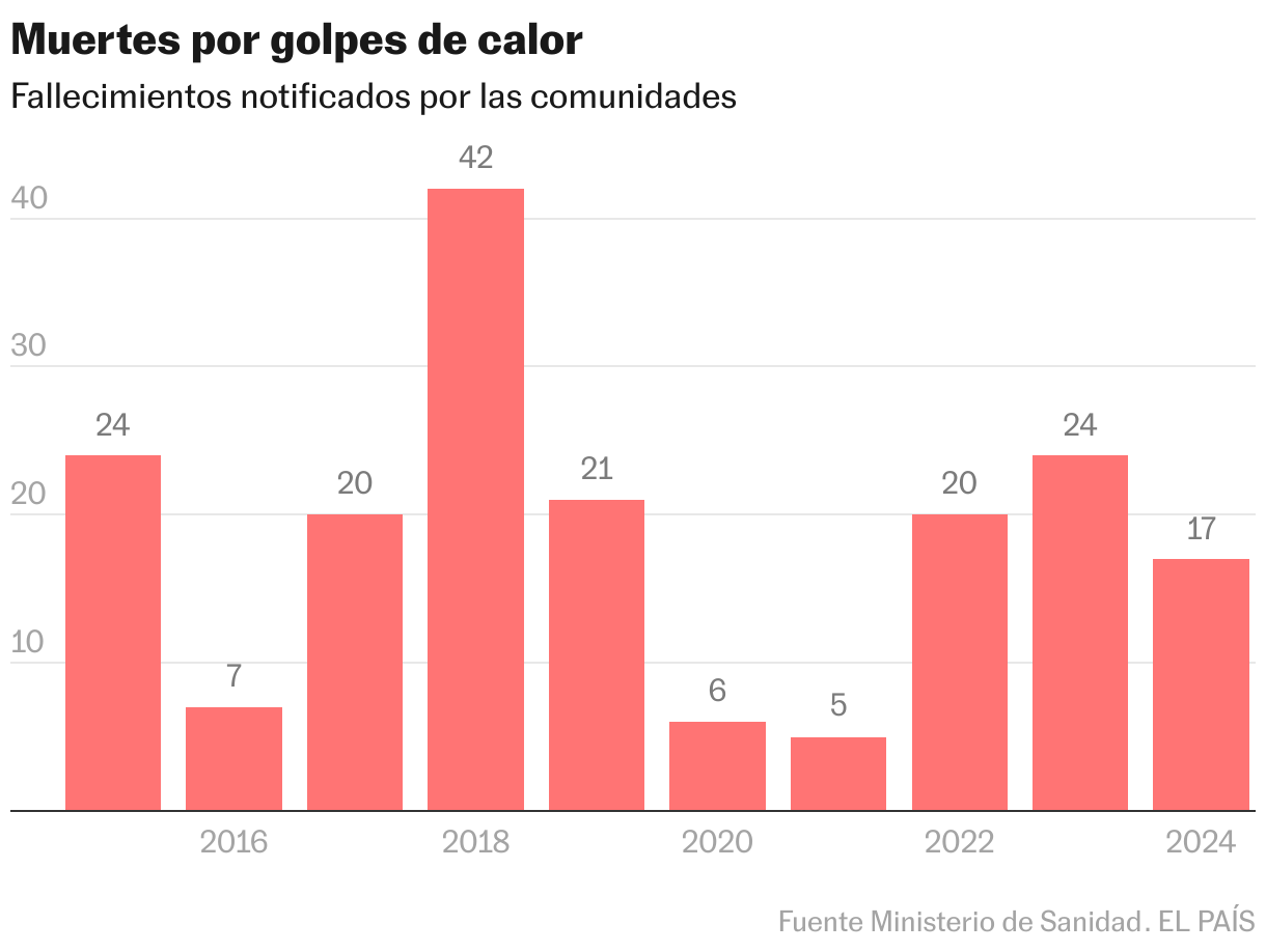 Les coups de chaleur sont, en tout cas, très rares. Les communautés ont informé l'année dernière 17 au ministère de la Santé et 24 en 2023. Pendant ce temps, le Momo a montré des chiffres de mortalité liés aux températures à l'été de 2 012 et 3,007 respectivement. De plus, ces deux statistiques et plus de 400 décès de juin sont très probablement courtes. Au cours des derniers étés, les études qui ont pris en compte plus de variables ont fortement élevé les chiffres de mortalité estimés par Momo.