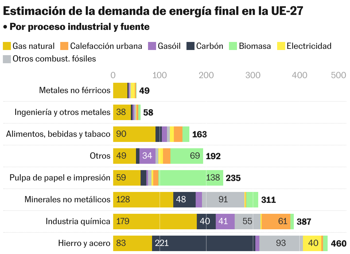 Une autre option est le biométhane, « mais il nécessite une plus grande affichage de plantes et son coût actuel double celui du gaz », disent-ils. « Les autres alternatives – capture d'électricité et de carbone électrique et renouvelable – ne seront pas réalisables à grande échelle dans les années à venir, et si elles sont égales ou plus chères que celles actuelles, il n'y aura pas de remplacement », prévient-ils. En fait, l'employeur calcule dans un rapport de 2023 que l'investissement pour la mise en œuvre de l'hydrogène ou de l'électrification signifiera 10 ou 15 fois la facturation annuelle du secteur: entre 56 619 millions et 81 613 millions, sans inclure la dépense de la modification de l'équipement de processus. « Le risque de relocalisation augmente et la perte de compétitivité est accentuée », soulignent-ils.